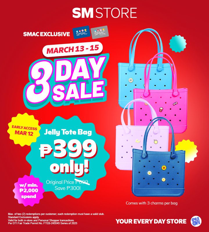 - Customers with SMAC or Prestige (physical or virtual card) with a minimum ₱2,000 single-receipt spend may avail a discounted Jelly Tote Bag in participating SM Store branches.
