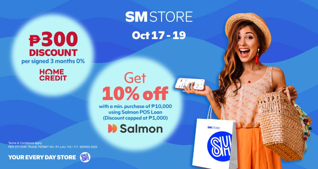 Get 10% OFF with a min. ₱10,000 spend using Salmon POS Loan or ₱300 OFF with a 3-month 0% installment plan using Home Credit!