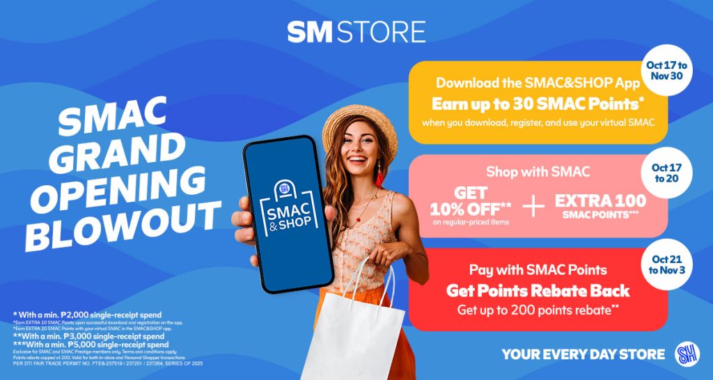 Download the SMAC&SHOP App to earn 30 SMAC Points, get 10% OFF on ₱3,000+ spend, earn extra 100 SMAC Points on ₱5,000+ spend, and enjoy up to 200 SMAC Points Rebate!